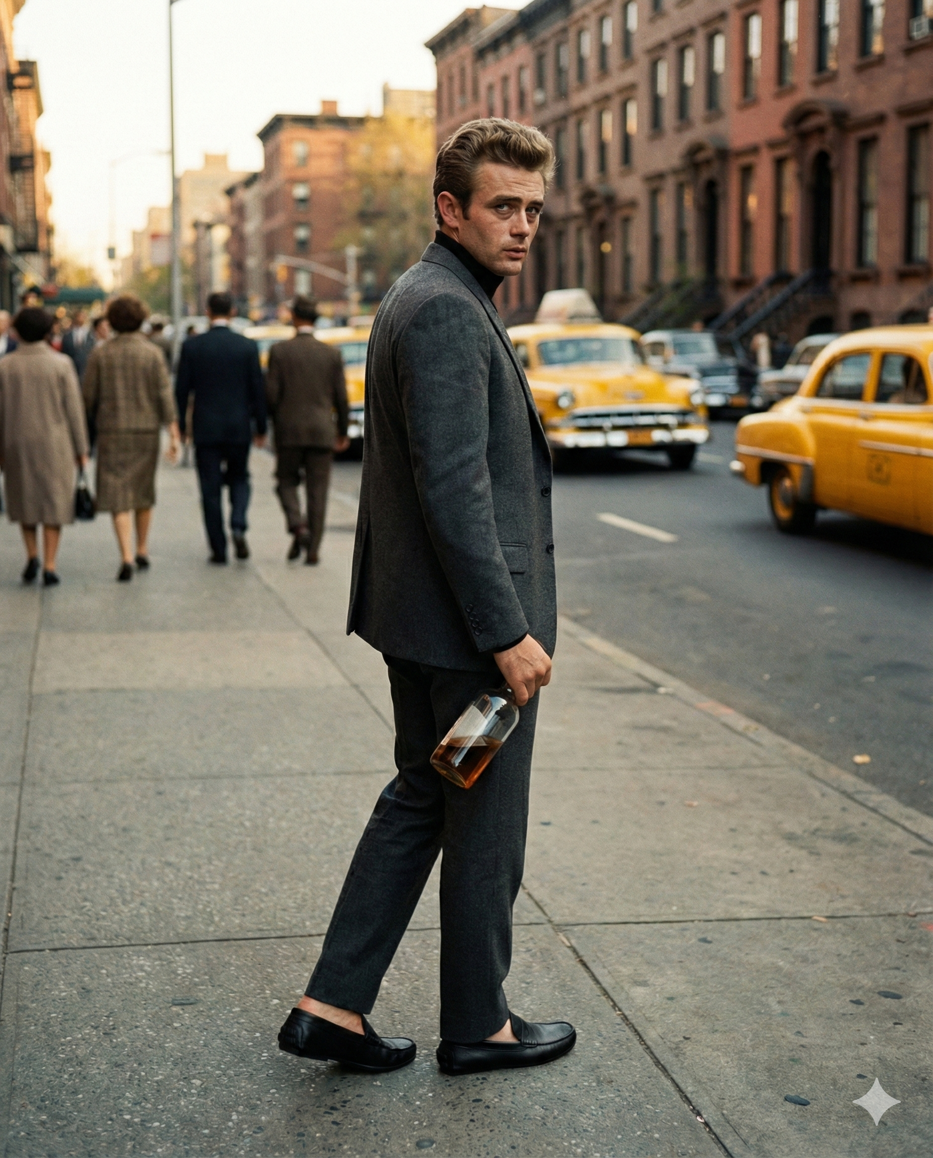 "좋아 이 인물을 유지한 채 다음의 이미지를 만들어줘. 뉴욕 5th ave. 10월 오후 golden hour 배경. 인물이 거리에서 한 손에 반쯤 마신 위스키병을 들고 걸으면서 카메라를 힐끔 쳐다보고 있음. 피곤한 얼굴이며, 머리카락이 헝클어져 있음. 시네마틱 야외 조명, 미드샷. 35mm 렌즈로 촬영."