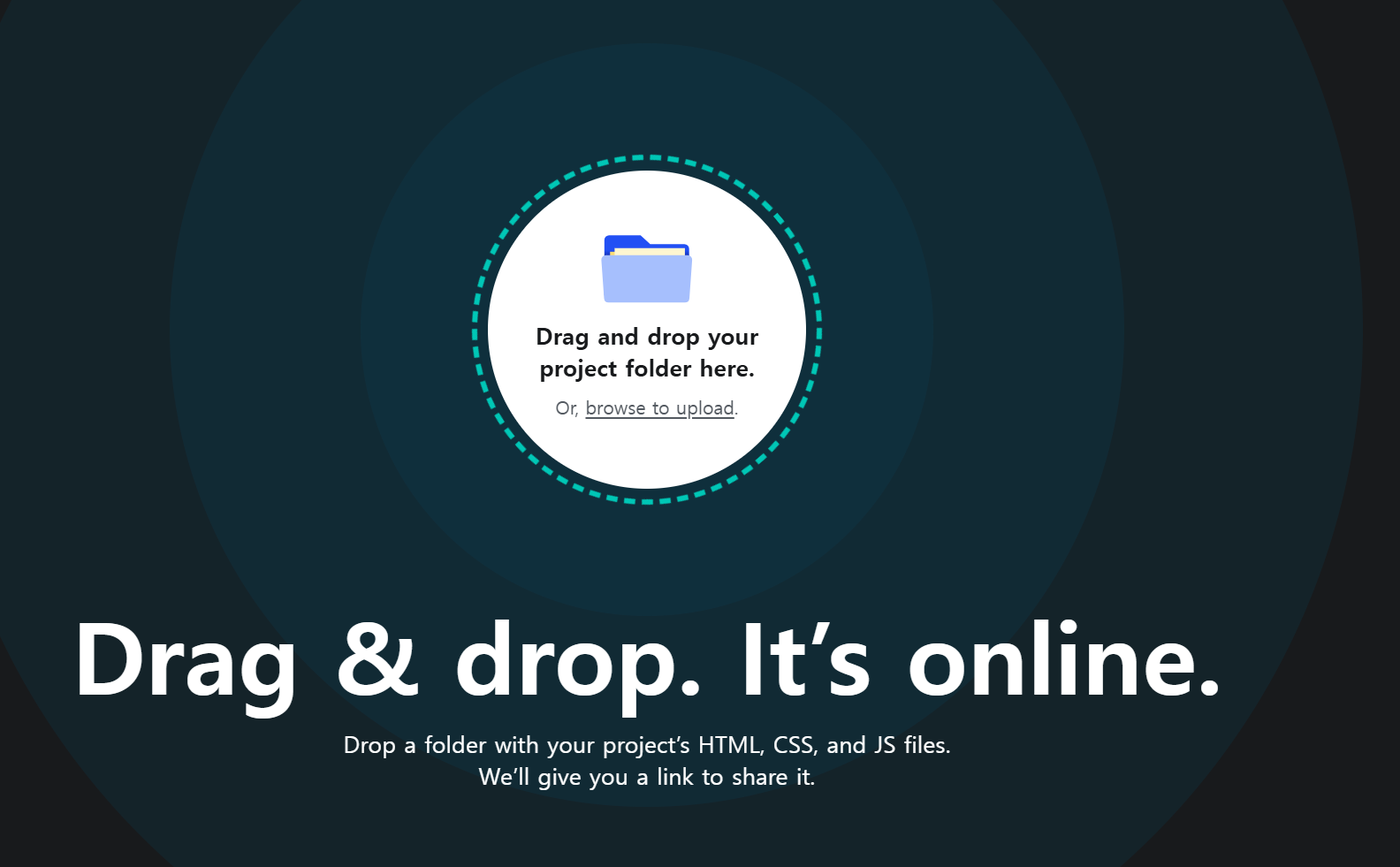 로그인 후 메인 화면(Team Overview) 하단을 보면 "Drag and drop your site output folder here"라는 점선 박스가 보인다. 여기에 아까 저장한 index.html 파일이 들어있는 '폴더'를 마우스로 끌어서 툭 던져 넣으면 된다.