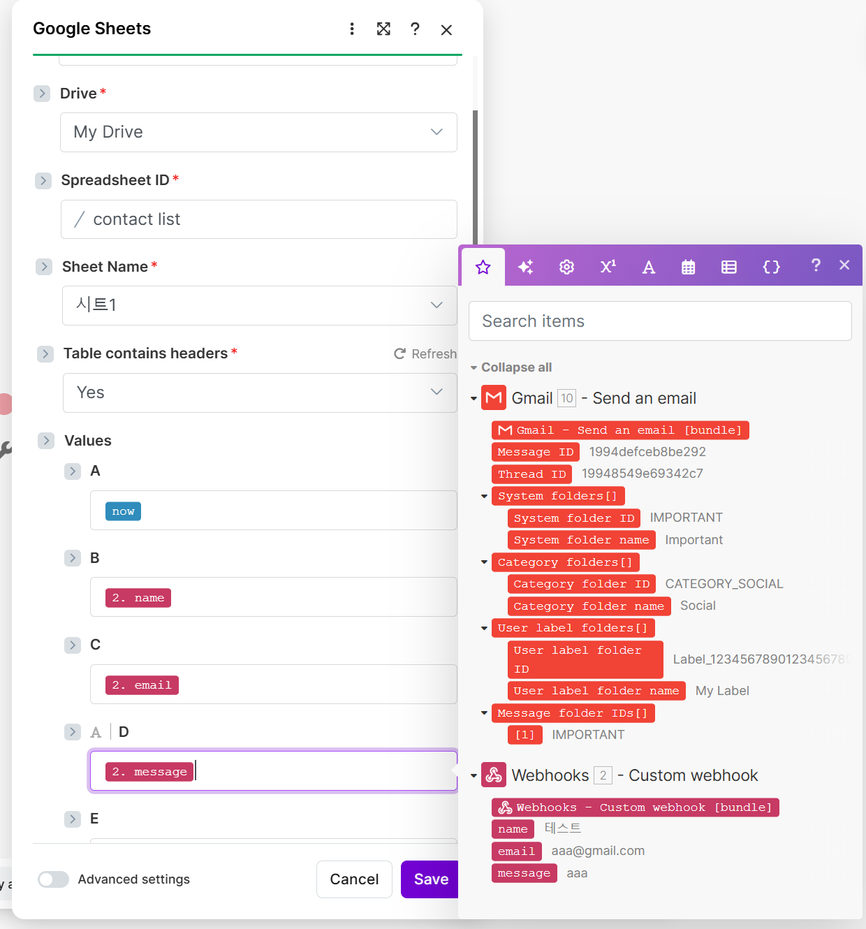 email을 넣는다. - D열 (문의내용): Webhook에서 받은